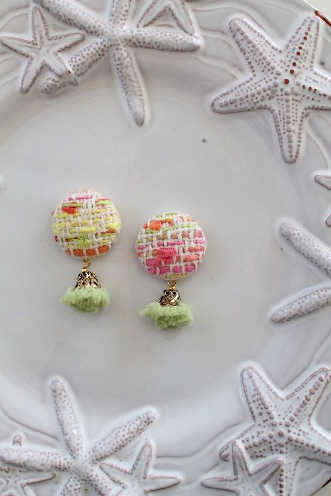 LINTONツイードイヤリングorピアス(Spring mix × bonbonタッセルgreen)